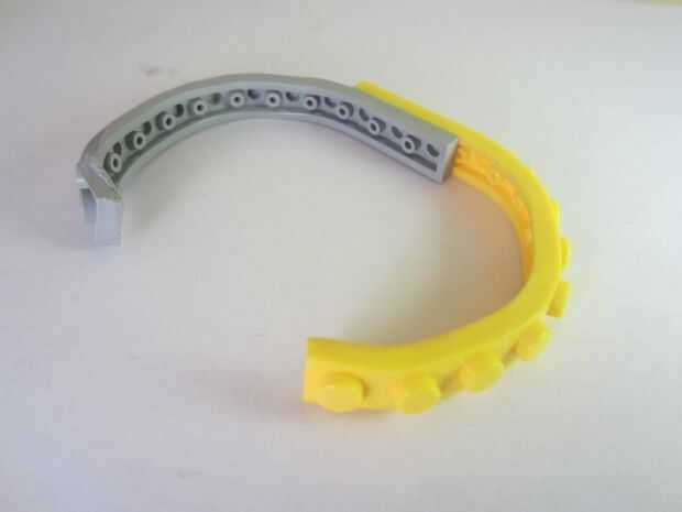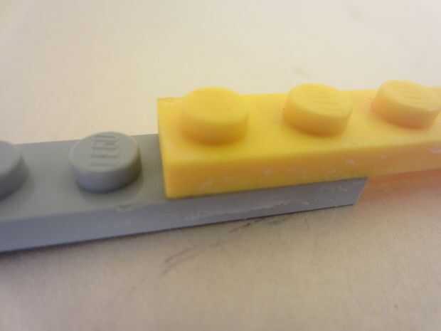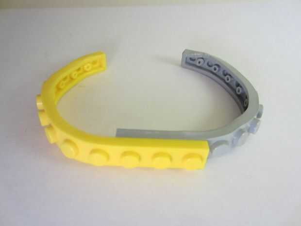 Conecte los dos ladrillos LEGO con dos secciones superpuestas,"." (como se muestra) Enchufe su pistola de aire caliente y encendido bajo. No apunte la pistola de calor en la sección central donde se superponen los LEGOs, en lugar de ello Apúntalo hacia los lados hasta que el plástico muestra signos de maleabilidad. Tan pronto como el plástico comienza a ver parada flexible y doble hasta aproximadamente la curva que se muestra en la imagen. Esto puede tomar varios intentos. Todo este proceso debe hacerse al aire libre para evitar inhalar cualquier gases nocivos que el plástico puede liberar.