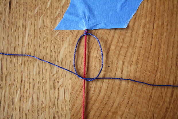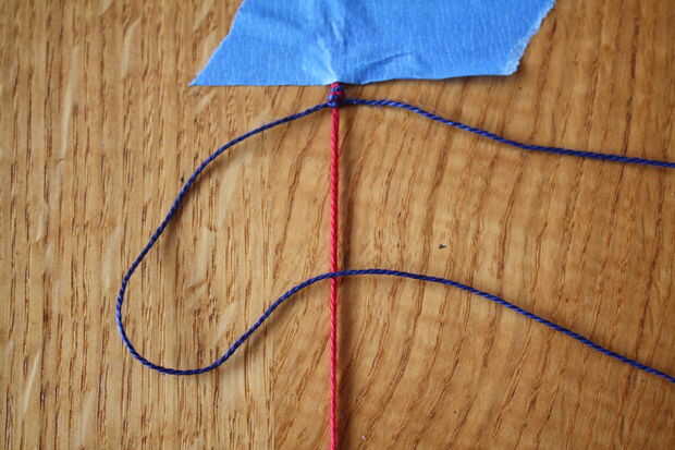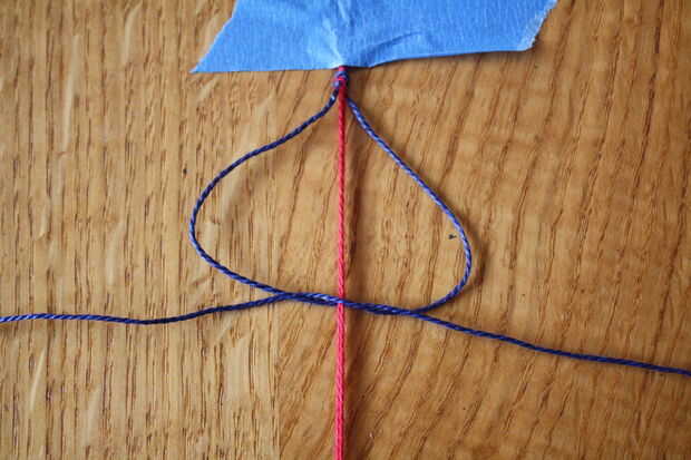 Ahora que tienes tomar uno de los filamentos hacia fuera y hacer un cuatro o al revés cuatro dependiendo de qué cadena te use. Tome el otro filamento de la ir sobre la cuerda que está hacia fuera, debajo de las cuerdas que vienen de abajo y a través del lazo de los cuatro y tirón firmemente. Luego hacerlo en el otro lado y usar la otra cadena. es decir. Utilice primero la cadena derecha y utilizar la izquierda.