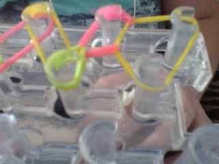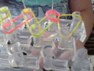 Ahora que han alcanzado la parte superior del telar, es tiempo de ciclar las bandas juntos. Voltee el telar con las flechas apuntando hacia abajo. Con su gancho, agarra la segunda banda de goma y lazo en la clavija siguiente. Coge la siguiente banda de goma y lazo en la clavija siguiente. A continuación, tome la siguiente banda y lazo en la clavija siguiente. Continuar haciendo esto hasta que haya alcanzado la parte superior del telar.