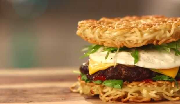 Dirigido por Keizo Shimamoto y vendido en Smorgasburg Brooklyn, Nueva York, el Ramen Burger, una empanada de glaseado en salsa de soja ubicado entre dos bollos de eggy ramen. Ramen instantáneo se convierte en un bollo de hamburguesa casi instantánea en este divertido y sabroso, la vuelta en una tradicional hamburguesa sazonada con salsa de soja y aceite de sésamo.
