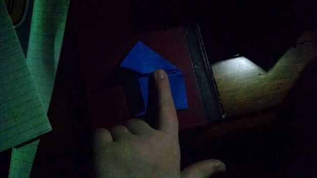 Ahora, una de las aletas del triángulo al otro lado (Fig. 1-3) doble y doble un cuarto de la parte inferior cuadrada hacia el medio (fotos. 4-5.) entonces, doble la solapa triángulo encima.