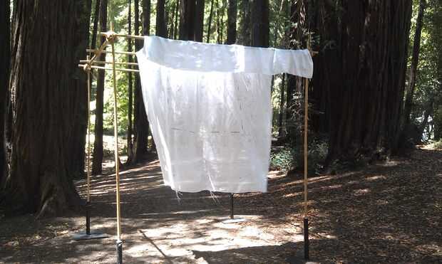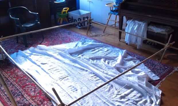 La cubierta para su recolección puede ser cualquier trozo de tela grande. He utilizado un mantel de encaje grande. Esto salió bien porque puse la cinta por los agujeros en el cordón para sujetar el mantel a la recolección.