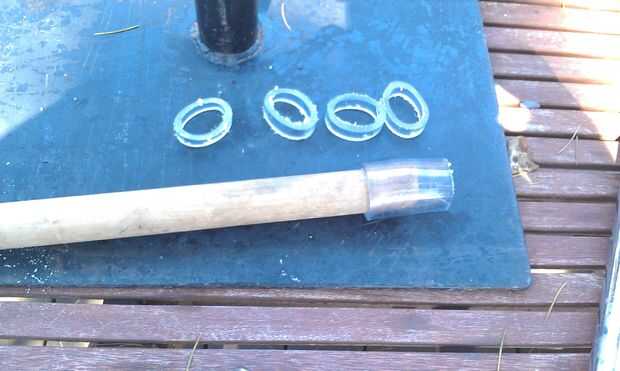 Por desgracia, no tengo una imagen del producto final. La foto de arriba muestra cómo he apoyado el tubo durante el corte. Le puse una cuña en la parte superior e inferior de la tubería de PVC. También hice que el tubo sea un poco más entonces el Paragüero por lo que pude pescarlo si necesitaba. Se puede ver el tubo de PVC sólo sobresale el está parado en el cuadro a la derecha.
