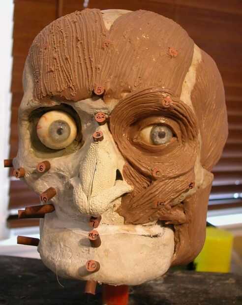 Aquí los músculos faciales individuales están esculpidos en. La colocación y grosor de los músculos son determinados por la morfología del cráneo (forma) y los marcadores de profundidad del tejido.