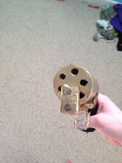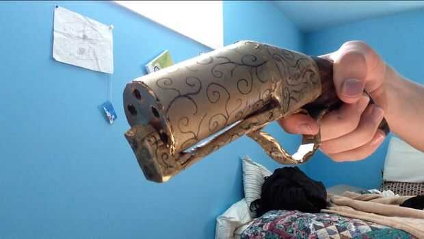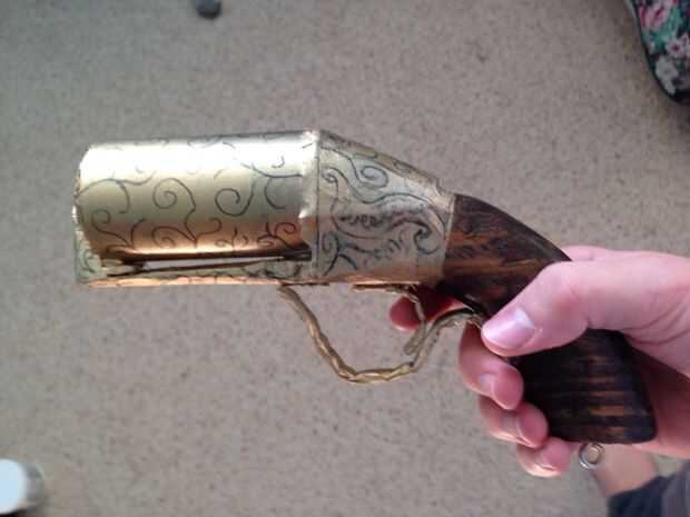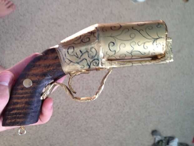 que tomó una pluma de caligrafía y algunas marcas de la pistola que parecen grabados como vería en pistolas de esta era. Luego, perforar dos agujeros en cada lado de la empuñadura, tomó dos clavos, pintados oro y usa un mazo de goma para conducir en la empuñadura. Esto concluye mi tutorial sobre hacer un pepperbox. Espero que os haya gustado y por favor darme un like o un comentario si lo hizo. Gracias por ver.