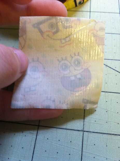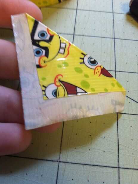 Primero, levante el lado pegajoso de la cinta de conducto. Ahora doble la esquina derecha sobre la izquierda y parte inferior forman una "L" en la viscosidad. A continuación doblar por encima la izquierda para hacer un triángulo y la parte inferior una línea recta.