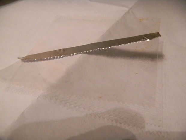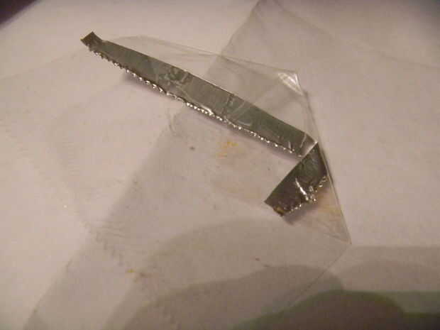 1. (Opcional) Cortar unas tiras delgadas de aluminio, aproximadamente 1/16-1/4" de ancho y 3" de largo. Estos reflejan parte de la luz emitida por el LED, dando algunos patrones interesantes.