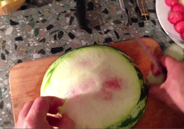 Retire la parte verde de la corteza de la sandía con el cuchillo. Tenga cuidado en el uso de este cuchillo, no daña las manos. Pele la corteza de la sandía verde dejando la forma redonda blanca. No te preocupes si esta forma blanca no es perfectamente blanca. Si pela lejos demasiado de la parte blanca de la corteza y hay algunas zonas rojo visibles, no hay problema, no será visible más adelante.