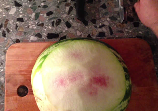 Lavar la sandía, asegúrese de que esté limpio. Para hacer un fondo plano tenemos que cortar un lado de la sandía (sobre dos o tres pulgadas).