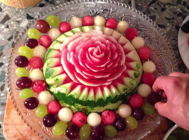 Coloque la rosa en el plato. Decorar la rosa con uvas, bolas de sandía y melón o cualquier otra cosa comestible que tengas en casa.
