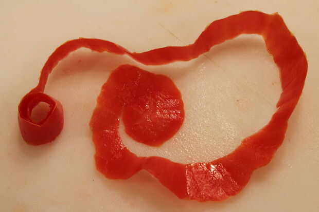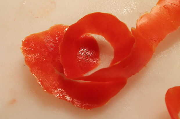 Cuidadosamente coloque la piel hacia fuera, lado carnoso arriba, en su trabajo de la superficie lo mejor que podáis. Puede empezar en cualquiera de los extremos para el balanceo de tus rosas, he proporcionado imágenes para ambos, dependiendo de que es más fácil.