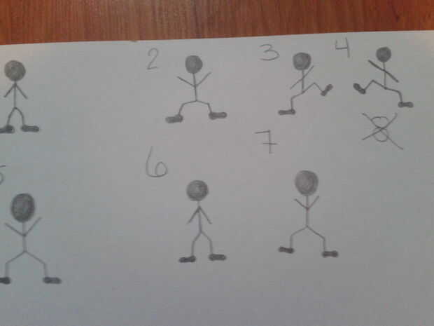 Comience con una idea que va a cambiar por 7 diferentes imágenes, pero terminará con la misma imagen primera que dibujas. Para mi rueca dibujé un hombre de palo bailando. \