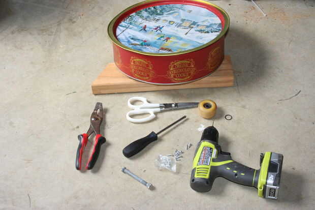 Para crear la rueda de ejercicio.  Se utilizaron una vieja lata de galletas, alicates, taladro, un perno tuerca y 3 1/2", un destornillador, tijeras o alta calidad tijeras una rueda del patín con rodamientos y una arandelas y tornillos.