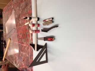Para este proyecto utilizamos un cuchillo exacto, espuma, una pintura acrílica, regla, rojo, plata y blanco, un cuadrado de la velocidad, un marcador y del pintor cinta, pinceles, papel de lija.