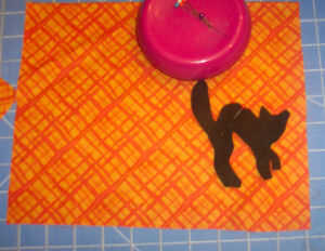Corte 1 gato de fieltro negro. Pin el gato a la parte delantera derecha inferior del lado bonito de la tela naranja.