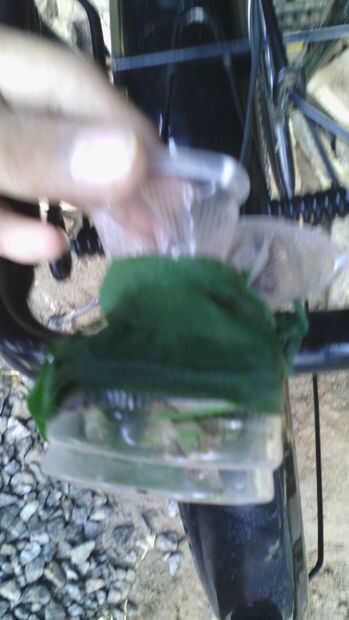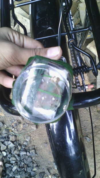 poner lo LED' s con la batería en un vaso de plástico para evitar la oxidación de la lluvia. y el vaso de plástico con cinta de flores o cinta aislante (se pueden ver dos cables que vienen desde el vaso de plástico). también atarla a la espalda del portador.