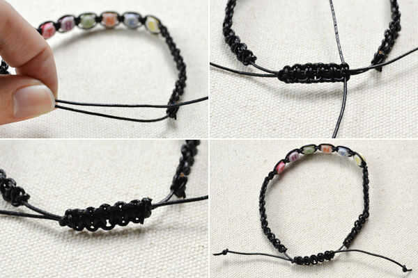 hacer 7, ambos extremos del medio traslapo de la cuerda juntos, cortan otro cable de cuero de 15cm y seis nudos cuadrados alrededor de los cables de mediados, entonces cortaron las cuerdas extras y un nudo, uso pegamento para arreglarlo si es necesario;