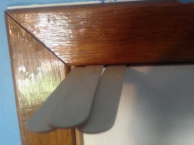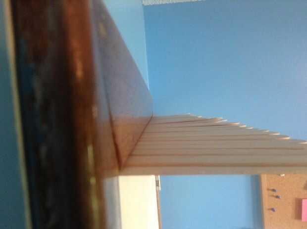 La parte superior de la puerta debería permitirle montar palos allí. Todo lo que hacen es colocar sus palos como lo hice. Así, colocar uno, luego otro uno en la parte superior, luego inferior que uno y seguir el patrón. No se puede hacer esto con los palillos más pequeños probablemente, así los ponen hacia fuera si usted está usando los palillos pequeños. Cuando haya terminado, debe tener como un reguero de palillos como muestra la segunda imagen. Probablemente, los palos en la esquina no caerá, pero es su elección.