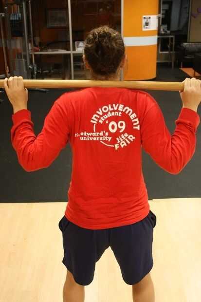 Coloque el palo de escoba en la parte superior de los omóplatos.