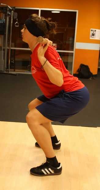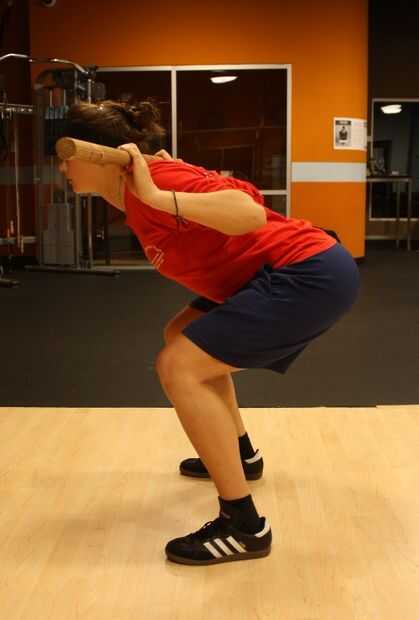 Manteniendo la espalda recta y ligeramente arriba (su punto vocal debe estar levemente elevada), bajo tu trasero como usted va a sentarse en una silla. Este paso es el más importante porque no puede dejar su cuerpo superior vaya más allá de las rodillas. (Ver cuadro #2 de forma incorrecta)