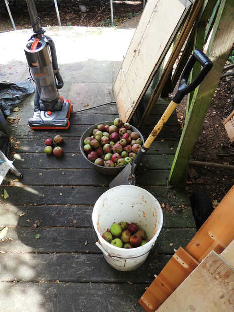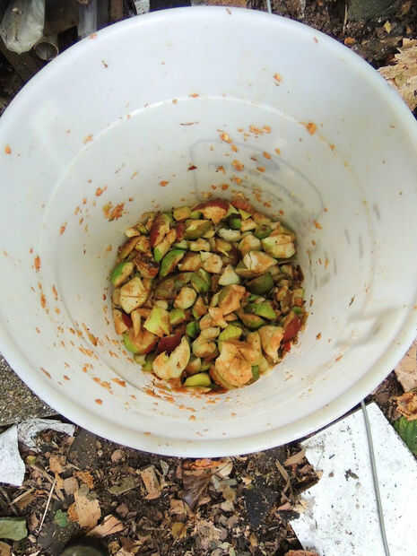 Una vez que las manzanas se cortan hasta aproximadamente 1" piezas, es el momento de triturar a una pulpa. Esto es muy muy divertido, pero después de un tiempo que puede ser un poco pesado, ya que tomar un montón de golpes. La forma más fácil es utilizar una longitud de madera (madera).