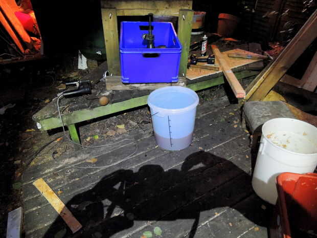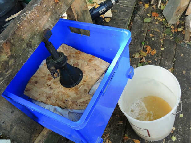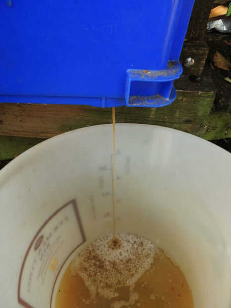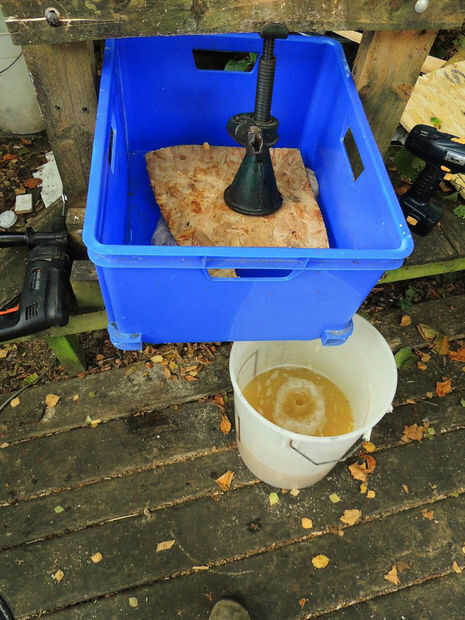Nota - antes de empezar a llenar la prensa, pone el recipiente que está cogiendo el jugo debajo de. Poco de jugo se sale tan pronto como se pone la pulpa, incluso antes del prensado. No lo desperdicies.