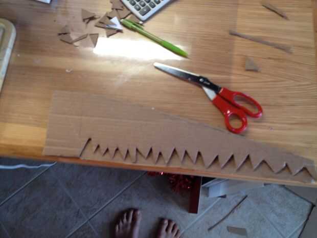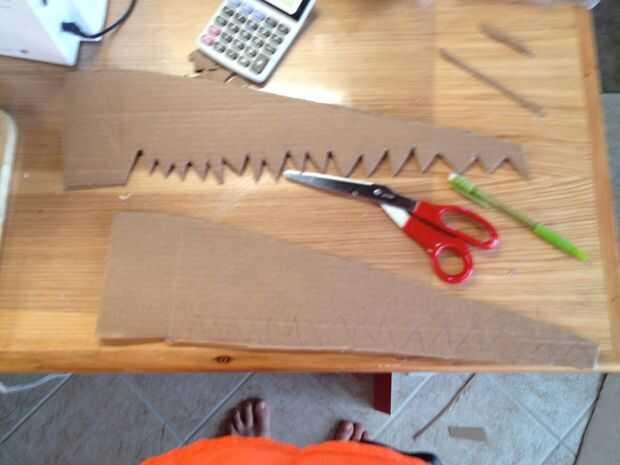entonces usted necesita cortar en forma de triángulo en ambos. Asegúrese de dejar un pequeño espacio antes de iniciar su pendiente y extraer los dientes. en uno y córtelo hacia fuera, luego rastro en la otra pieza. Luego pegar con pegamento caliente y pegado a un palo de pintura en el centro de apoyo