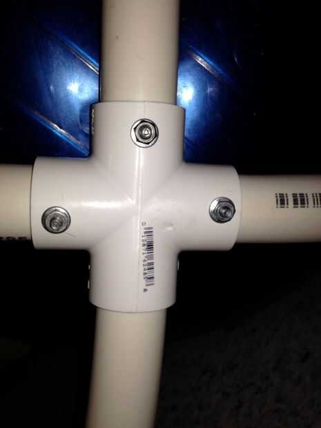 3) a continuación, en lugar de pvc se coloca en el cruce en t, estas piezas dobladas se inserta en los lados de la Cruz 4 accesorios. En la parte inferior de estos accesorios será el pvc que es desde la base de la silla. El único cruce en t que debe ser en esta parte de la silla está en el muy delantero porque esto va a ser que se cuelguen de sus piernas.