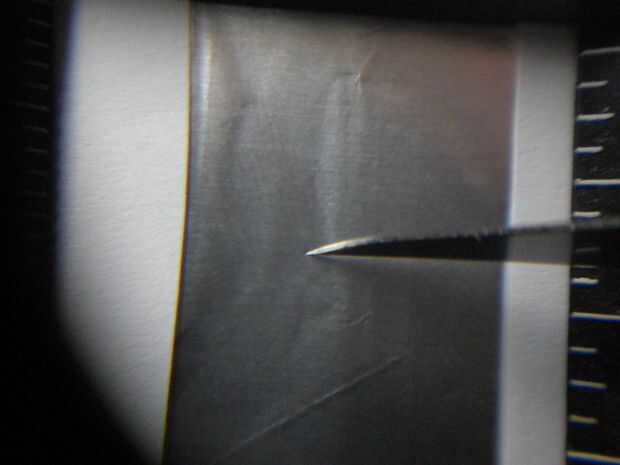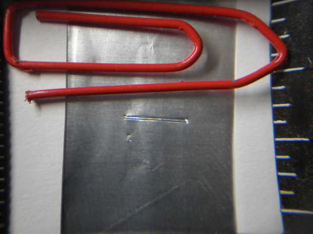 Usar el cuchillo x-acto para cortar dos ranuras rectas tan juntos como sea posible sin dañar la tira pequeña de papel entre ellos. Una lupa es muy útil para cortar más precisamente.