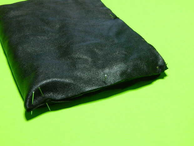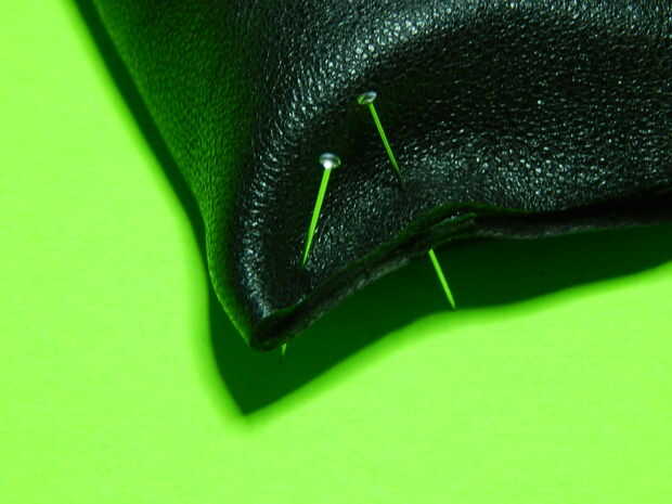 Siguiente meter alfileres en la piel a lo largo de la costura, uniformemente espaciada unos de otros.