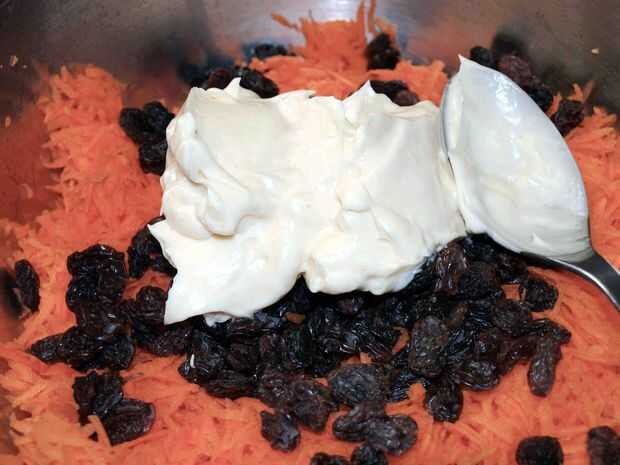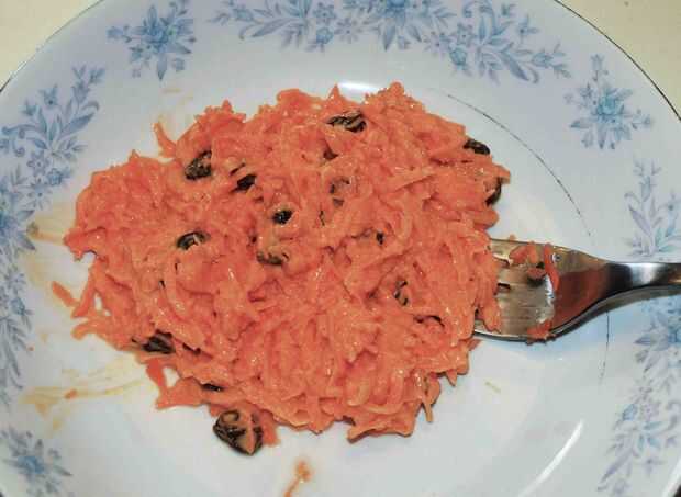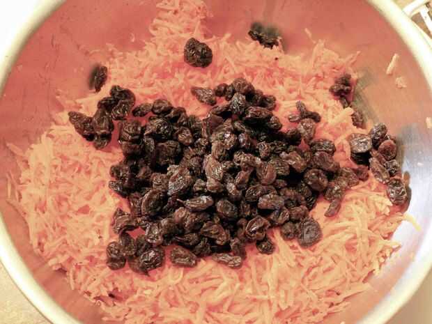 Usted puede dejar de mezcla y comenzar entrega enseguida si te gusta, pero he encontrado es mejor dejarlo enfriar en la nevera durante unas horas. Esto da la oportunidad de mezclar un poco los sabores y también las pasas comenzará a plump encima del jugo de las zanahorias.