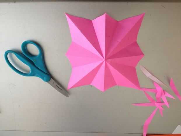 Cortar los bordes de la cubierta de paraguas plegado. Semi círculos se cortan para el eje pequeño (es decir, los más pequeños triángulos doblados en el paso 3), mientras que el más grande (la longitud exterior restante) se corta en curvas amplias.