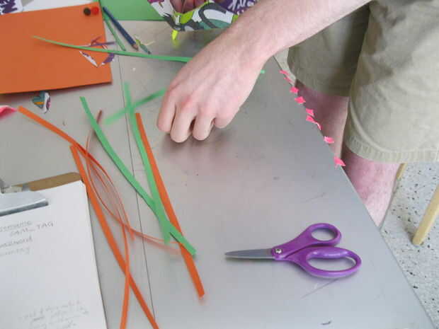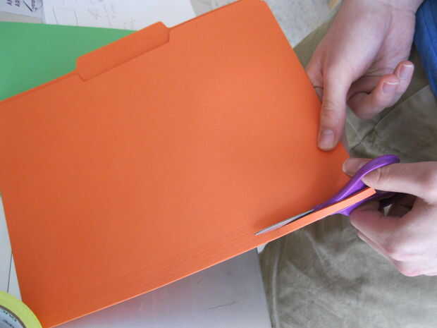 Cortar ocho largas, delgadas tiras de papel de la carpeta de Manila. Estas piezas se convertirán en los brazos del mecanismo de plegado. Pegue cada tira en el interior frente a los pliegues de la parte inferior de la cubierta del paraguas, asegurándose de que estén bien hechas por parte de la longitud de la cubierta de paraguas.