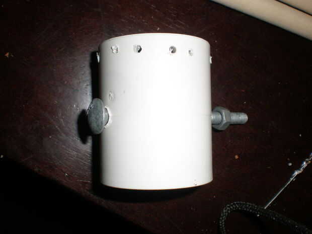 Entonces, taladro 12 pequeños agujeros en un círculo en la parte superior del PVC de acoplamiento y dos agujeros más grandes en la parte delantera y trasera del centro. Este será el regulador de paraguas, así que tenlo largo perno con él por ahora.