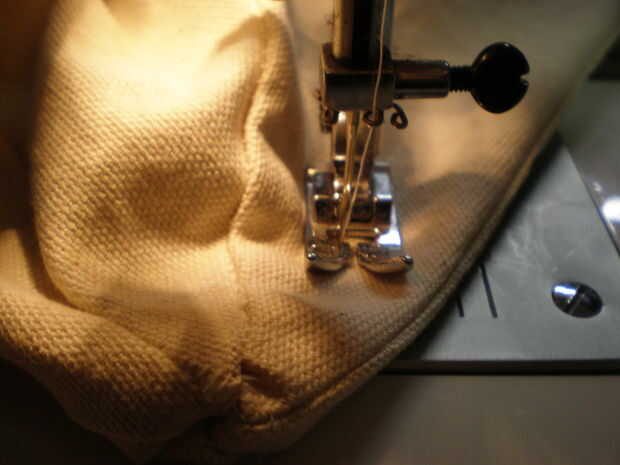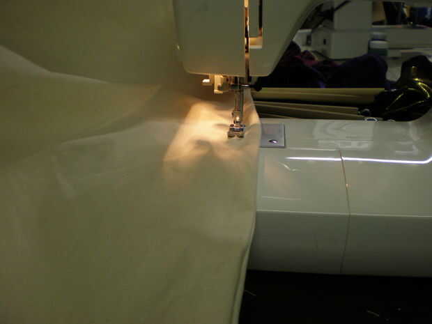 Coser los bordes largos juntos para que todas las costuras están en el mismo lado, luego volteen la tela y repetirán. Lo que estamos haciendo aquí está haciendo vainas para los radios de paraguas, sin dejar la posibilidad de exceso de desgaste.
