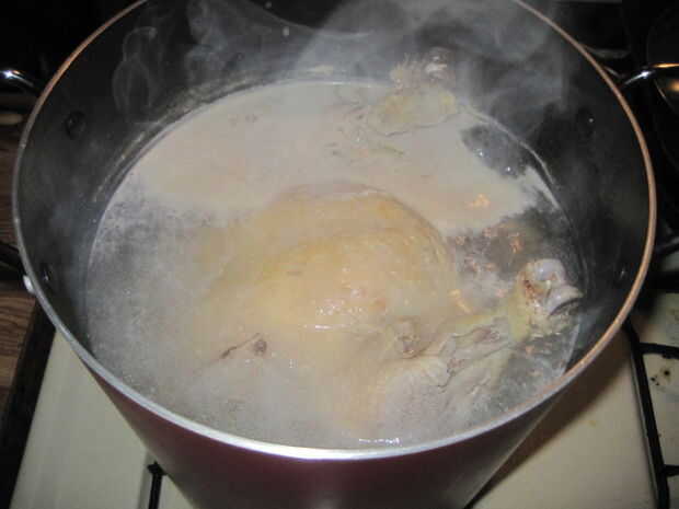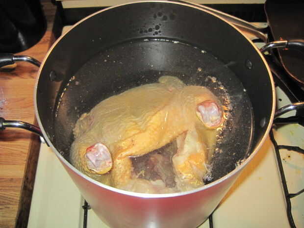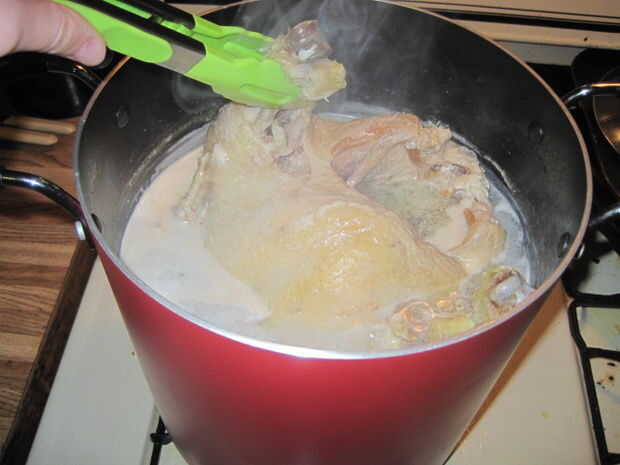 • Tip: Sea paciente y compruebe el pollo sobre cada 20-30 minutos utilizando las pinzas para tirar en una de las patas. Si no elimina fácilmente, continuar dejar que hierva. Me tomó casi 3 horas a hervir el pollo congelado que pesaba 7,6 libras suficiente que fácilmente fue eliminado de los huesos.
