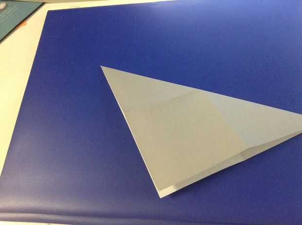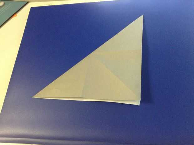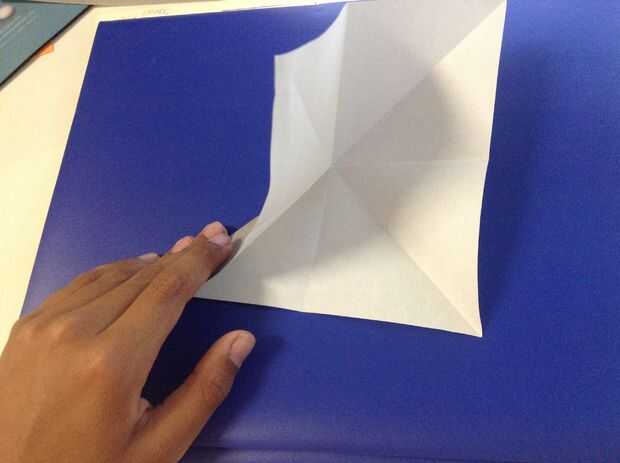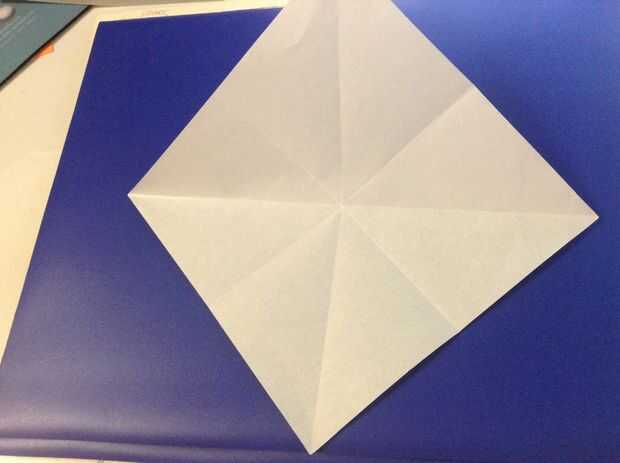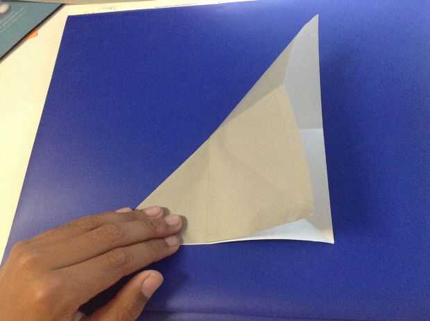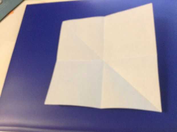 Primero dobla el papel en medio de ambos lados. Luego dóblalo diagonalmente en ambos lados.