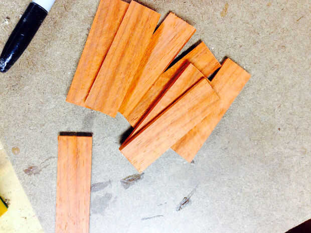 Usando las tiras de padauk que reservan, cortar en trozos un poco más de 3 pulgadas.   Puede recortar el exceso en la Sierra de mesa después.