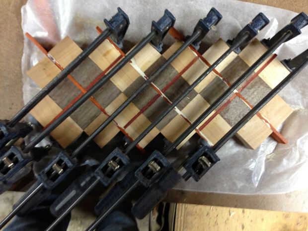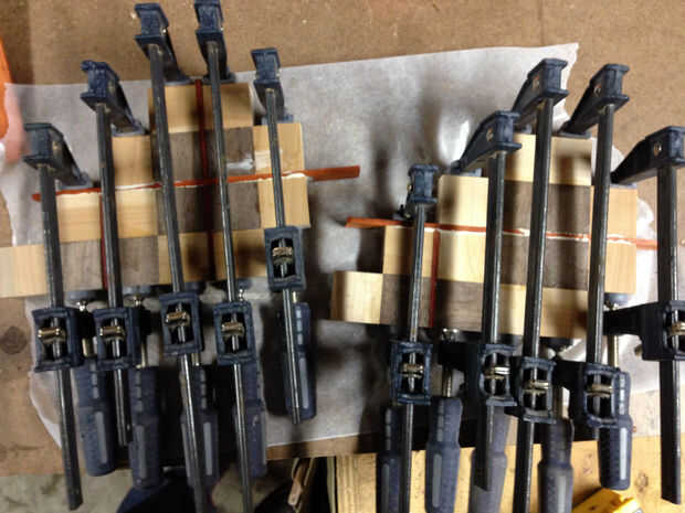 Cortar algunas longitudes más largas de padauk (alrededor de 8 1/2 pulgadas) y éstos entre las piezas en el 2 º pegamento del pegamento.  Lo hice en dos pasos, dejando la raya de centro para el final.