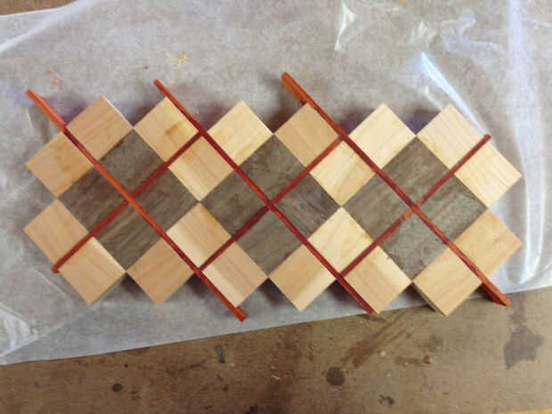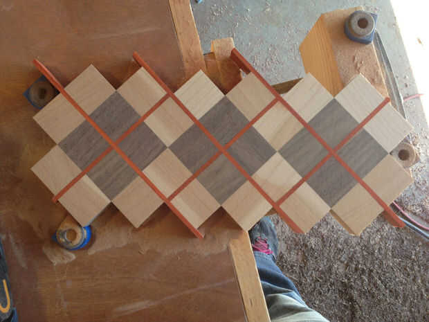 Usando una lijadora de banda con un cinturón de 60 grano, he nivelado y alisado hacia fuera de ambos lados de la raya de argyle. Como se puede ver en la primera foto, es bastante irregular y tiene un montón de pegamento en la superficie. Que tenía que hacer esto antes de cortar en la mesa de sierra para obtener cortes bien.