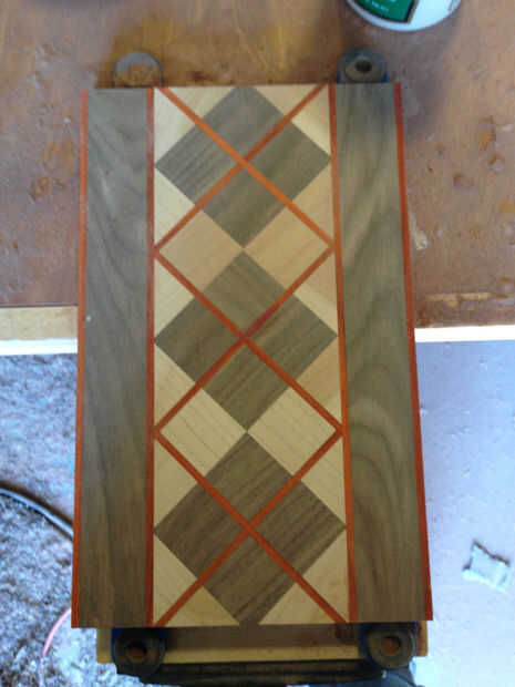 Las franjas laterales fueron ligeramente más gruesas que la raya de argyle.  Otra vez, saqué la lijadora de correa con la correa de 60 grano para hacerlo incluso con el medio.  Repetir en el reverso.