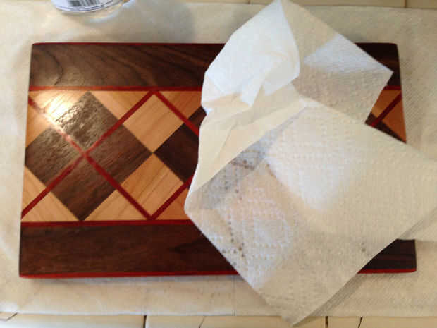 Aplique la mezcla del aceite o la cera a la superficie del tablero, repartidos por, esperar... esperar... esperar... Esto lleva tiempo en remojo. Dejarlo reposar al menos unas horas, pero prefieren dejar que sentarse durante la noche.