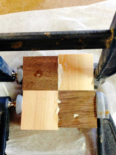 Pega dos cuadrados de centro como se muestra.  Que tuyo será un poco más.  Mina debían cortarse en la Sierra de mesa antes de Asamblea más.
