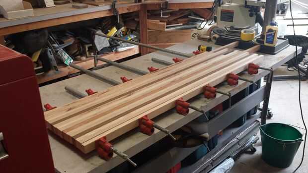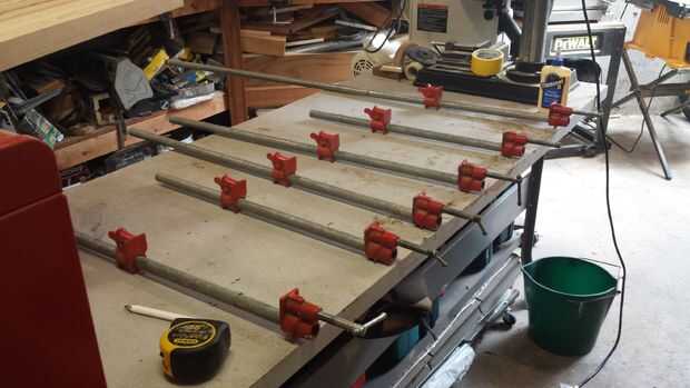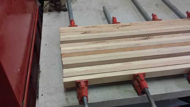 Pone tus tiras de madera en las abrazaderas y configurarlo como si iba a pegar. Esto es cuando usted busque el orden correcto de las tiras y asegúrese de que todo se alinea. Cuando todo parece listo que todo listo para pegar.