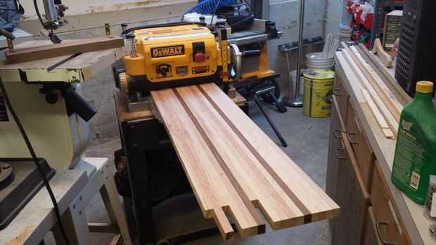 Después de que el pegamento ha tenido tiempo para secar, que ejecutará el tablón a través de la cepilladora y plano todo el conjunto liso en ambos lados. Suelte la Asamblea y prepararla para ser cepillada. Ajustar la altura del cepillo para sacar una cantidad muy pequeña al principio. Menor será la cantidad de corte más suave corte y mejor será el producto final. Pase la plancha el cepillo poco a poco bajando la altura de corte hasta que cada lado es perfectamente liso. Una vez que cada lado es liso listo para el paso de la red.