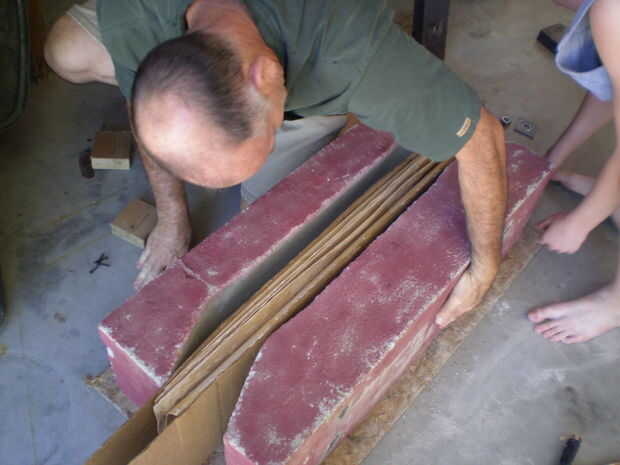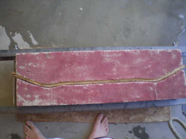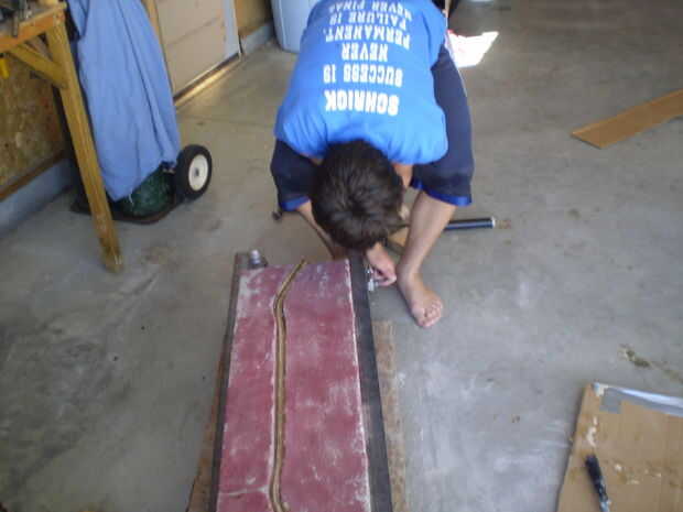 Luego, poner el molde en su lado y pegue el venners entre el molde y el cartón, después tomar 2 hierros de canal 4' y una de 20" a 16" pernos con tuercas y arandelas. Ahora poner los hierros de canal en el centro del molde para que tenga una buena prensa agradable. una vez hecho esto deja que la cubierta tome su forma para cerca de 1 a 1 1/2 días para curar bien y fuerte