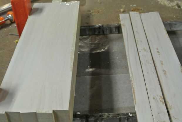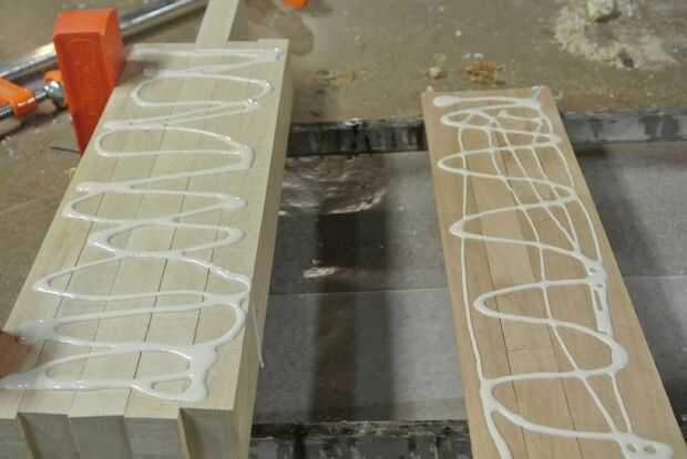 Aplicar una cantidad generosa de pegamento a todas sus tiras de madera y propagación. Me gusta usar un pincel de silicona. Gran trabajan, son barato, reutilizable y fácil de limpiar (colada de sacarlos con agua o esperar a que el pegamento seque y solo tirón de ella).