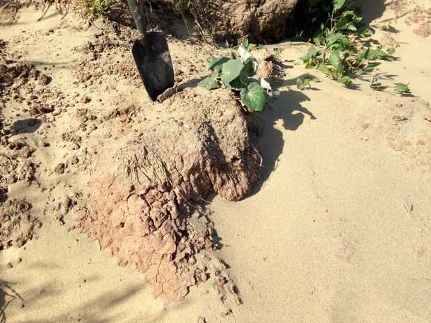Encontré mi arcilla en una playa con un acantilado. Esto hizo acceder a la arcilla muy fácil, sin embargo esto significó que la arcilla estaba cubierta de arena que hace menos puro. He intentado reducir la cantidad de arena tocando la arcilla mi raspado la capa de arena y superior de la arcilla. Luego cavé una pequeña cantidad de arcilla.