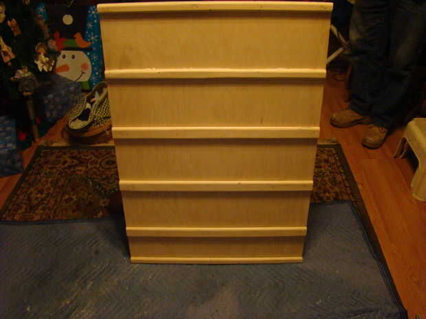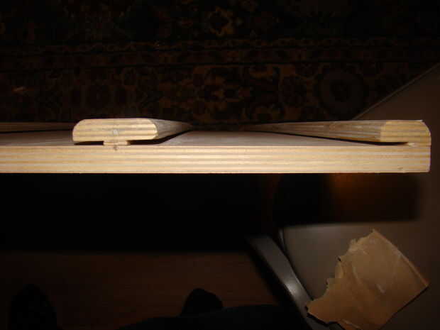 Marca con tu lápiz, en el tablero principal, donde usted quiere las tablas estrechas para ir. Sacar el compresor de aire y pistola de clavo. (Puede usar una clavadora eléctrica o un martillo y clavos; Sólo te digo cómo lo hicimos.)  Poner un hilo de pegamento de madera por la mitad de la parte posterior de cada franja y luego los clavos hacia abajo en este orden;