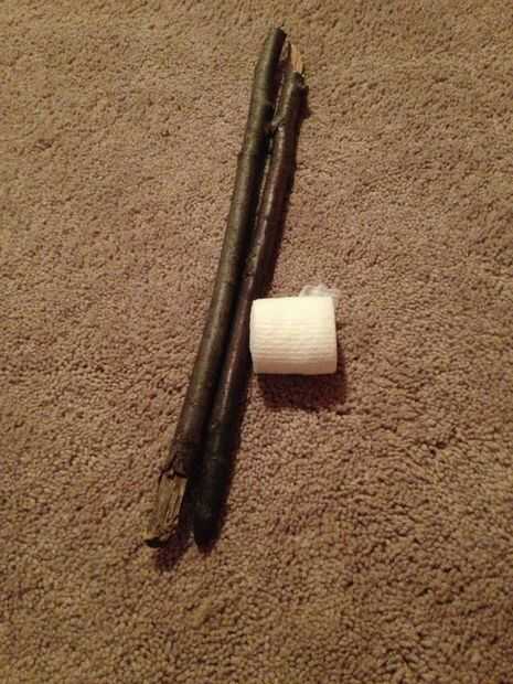 Para esto necesitas 2 barras y algún abrigo de Gasa. También puede utilizar cinta adhesiva para conductos. Va a hacer esto para un brazo roto, pero también se podría utilizar para una pierna fracturada con palos más largos